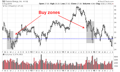 In the chart below, I have marked the zones when Berkshire bought its SU stake below. Last night`s closing price of USD 27.66 is right about where Buffett had bought his positions. In other words, you and I can buy SU now at roughly the same price as Buffet bought his stake.