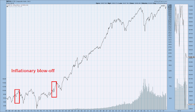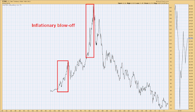 The price of gold had been fixed until 1971 and therefore we cannot gauge past inflationary expectations using gold. We can, however, going further back into history by using other indicators such as the 10-year Treasury yield, which does respond to inflationary pressures. The chart below shows that we can see evidence of an inflationary blow-off in the 1968-1970 market, as evidenced by rising yields on the 10-year note. As well, the 1979-1981 episode also saw a spike in yields.