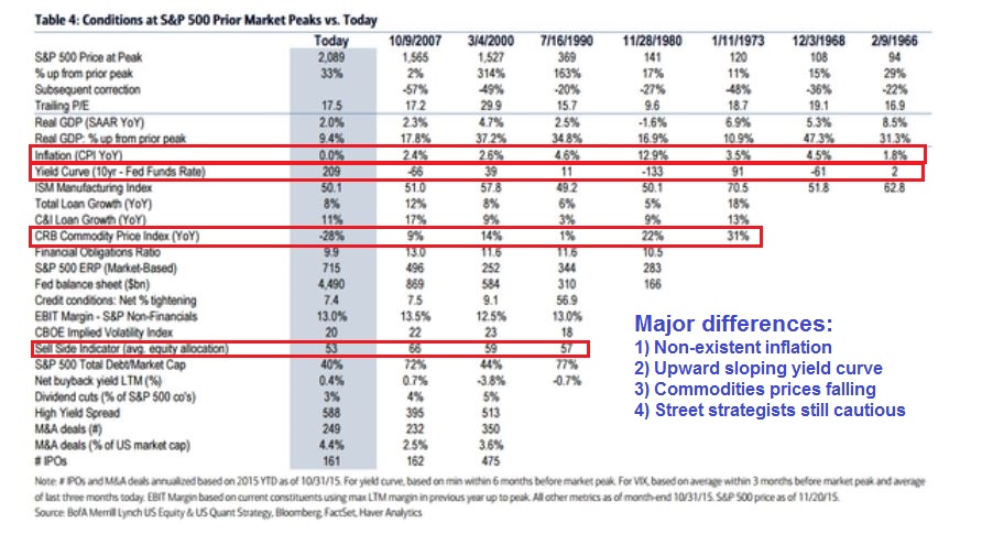 BoAML analyzed the equity markets in a similar way by comparing current conditions to previous market tops. The biggest outliers are:
