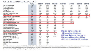 • Falling commodity prices, whereas past peaks have featured rising commodity prices, which is a sign of rising inflationary expectations (see above comment about non-existent inflation and see Chris Ciovacco’s comment about how falling commodity prices are not stock market killers); and