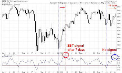 In my last post, I wrote about the possible appearance of a rare Zweig Breadth Thrust buy signal this week (see The 2016 macro surprise that no one talks about). Tuesday was the last day in the 10 day window for the ZBT buy signal to be triggered. Alas, it doesn’t seem to have happened.