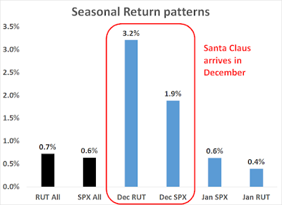 What about a snap back from tax loss selling? Could stocks perform better if we had a down year? I studied average stock returns based on whether the RUT was positive or negative on a YTD basis as of November 30. What I found was highly unexpected. Small cap stocks performed better in December as a whole and paradoxically did worse when November YTD was negative. In effect, ther was no small cap January effect. However, there was a minor large cap January effect as the SPX did perform better when RUT was negative YTD to November. That results seems somewhat dubious and illogical and I would attribute it to noise in the data.