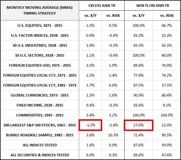 He tested a couple of other strategies, namely crossing moving averages and momentum and found that results were quite similar. The MMA results are summarized below: