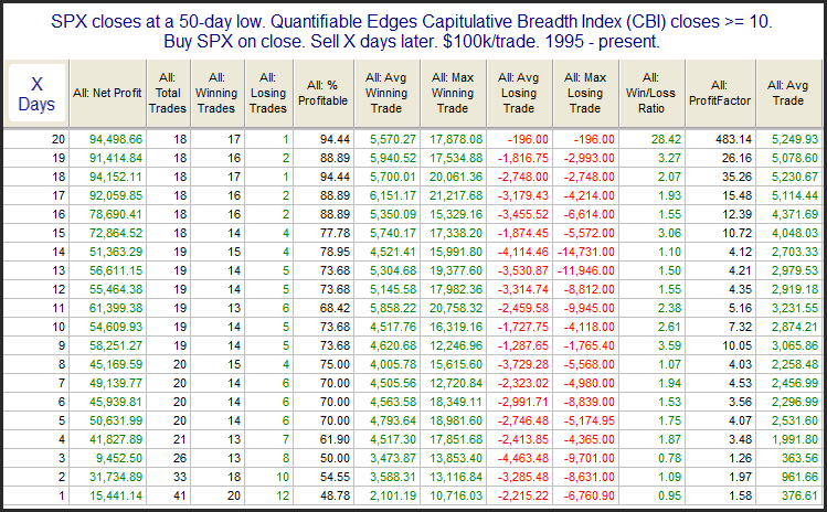 Quantifiable Edges expressed similar concerns as I did about the lack of fear. He wrote this morning that he was also seeing the oversold conditions, but he was concerned that his Capitulative Breadth Index (CBI) was only 0, which is a very low reading. He went on to show statistics for past returns when the market was oversold and CBI was 0. The results suggest a very short-term bounce, followed by more weakness.