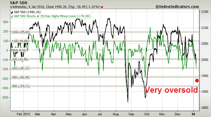 Here is the net 20-day highs-lows, which is a OBOS indicator over a 1-2 week horizon: