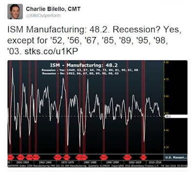 Much of the slowdown has been driven by weakness in manufacturing, as exemplified by the weak ISM Manufacturing release. However, Charlie Bilello pointed out that ISM Manufacturing has had a spotty record of forecasting recessions in the past (also see these comments from David Rosenberg).