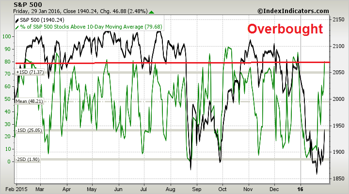 These breadth charts from IndexIndicators show that the market is overbought and vulnerable to a pullback (annotations in red are mine).