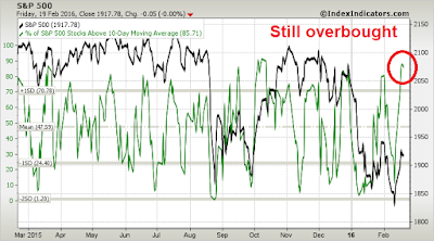 Further, breadth indicators like this one from IndexIndicators shows that the market is overbought, which will make it difficult for equities to advance next week.