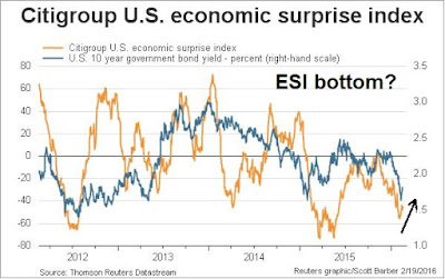 However, the Citi Economic Surprise Index (ESI), which measures whether high frequency economic releases are beating or missing expectations, is showing signs of a bottom and turnaround. The ESI (gold line) has been positively correlated with the 10-year Treasury yield (blue line). A rising ESI could push up 10-year yields, which would likely steepen the yield curve.