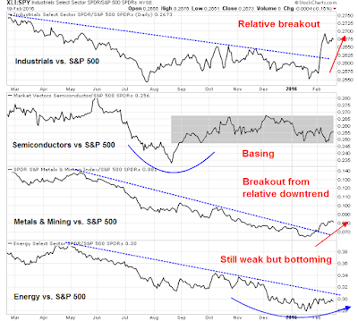 The relative performance of cyclically sensitive equity sectors and industries are also signaling a possible growth surprise. The chart below shows the relative returns of different cyclical sectors and groups. Industrial stocks have been the strongest and they staged a rally and upside relative breakout; Semiconductors having bottomed on a relative basis and now consolidating sideways; Metals and Mining have broken out or a relative downtrend; and Energy is the only sector that is in a relative downtrend, though it does seem to be bottoming.