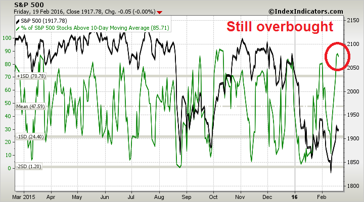 My inner trader is cognizant of the positive news from forward EPS and he was tempted to close out his small SPX short position on Friday (see Why I tactically shorted stocks today). In the end, his analysis of the technical picture led him to believes that the market may still have some unfinished business to the downside before the current corrective episode ends.