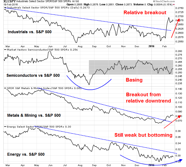 The relative performance of cyclically sensitive equity sectors and industries are also signaling a possible growth surprise. The chart below shows the relative returns of different cyclical sectors and groups. Industrial stocks have been the strongest and they staged a rally and upside relative breakout; Semiconductors having bottomed on a relative basis and now consolidating sideways; Metals and Mining have broken out or a relative downtrend; and Energy is the only sector that is in a relative downtrend, though it does seem to be bottoming.