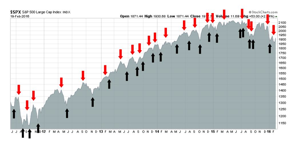 My inner trader uses the trading component of the Trend Model seeks to answer the question, “Is the trend getting better (bullish) or worse (bearish)?” The history of actual out-of-sample (not backtested) signals of the trading model are shown by the arrows in the chart below. Past trading of this model has shown turnover rates of about 200% per month.