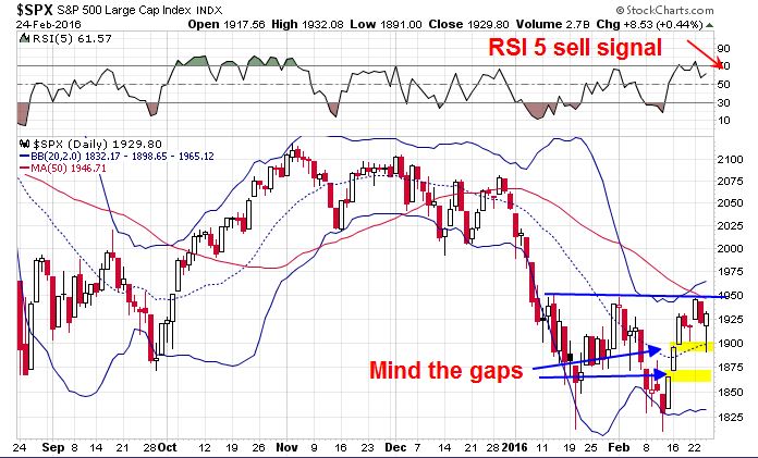 Here is where the SPX stands today. The rally was unable to overcome technical resistance earlier in the week at 1950 and at the 50 day moving average (dma). Moreover, the 5-day RSI flashed a sell signal by moving from an overbought reading (above 70) and then falling below 70. Two overnight gaps (shown in yellow) had the potential to get filled as the market weakened. The first gap got filled this morning, but stocks rallied intra-day.