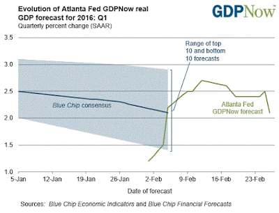 The report was negative enough that the Atlanta Fed’s GDPNow estimate of Q1 GDP growth slid from 2.5% to 2.1% because of the effects of the inventory buildup.
