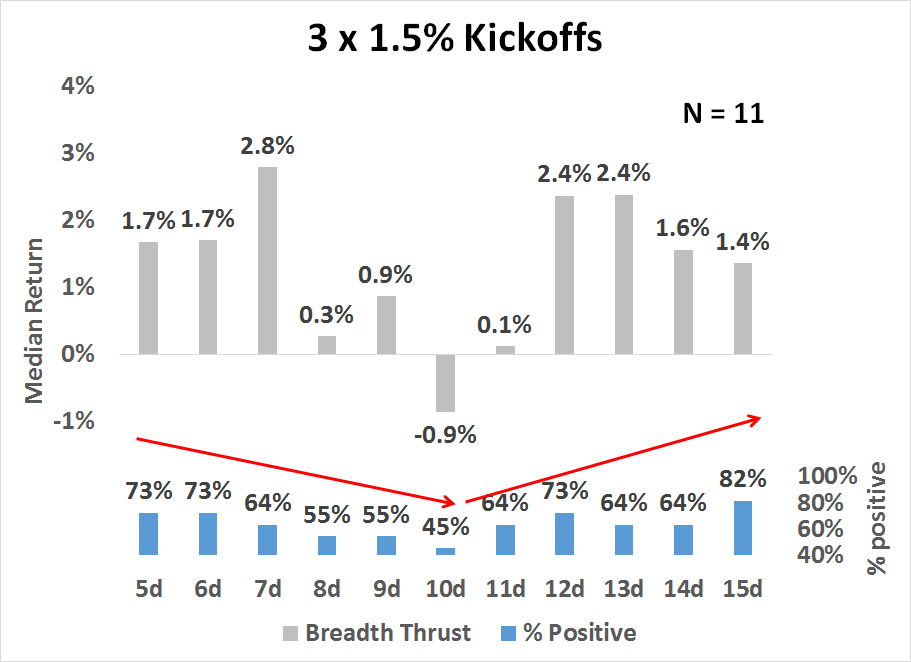 I wrote last week that the market had until last Friday to flash a Zweig Breadth Thrust buy signal (see Mind the gaps), which it failed to do so. However, Simon Maierhofer, writing in Marketwatch, alerted us last week to an equally bullish “kickoff” signal, in which the SPX rose for 1.5% or more for three consecutive days. He pointed out that such conditions have represented a bullish impulse in the past where stocks were substantially higher a year later.