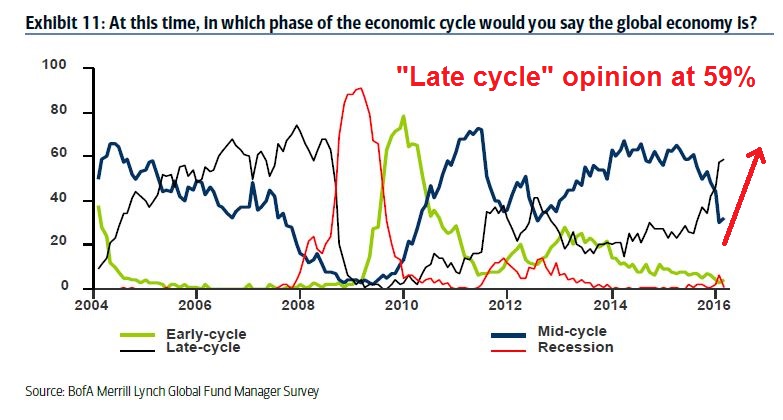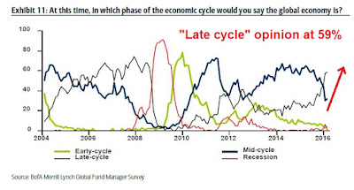 In the last few weeks, I had been writing about a transition to a late-cycle market. The latest results from the BoAML Fund Manager Survey show that 59% of institutional managers believed that we are in the late-cycle phase of the expansion cycle. The 59% figure is the highest reading since August 2008.