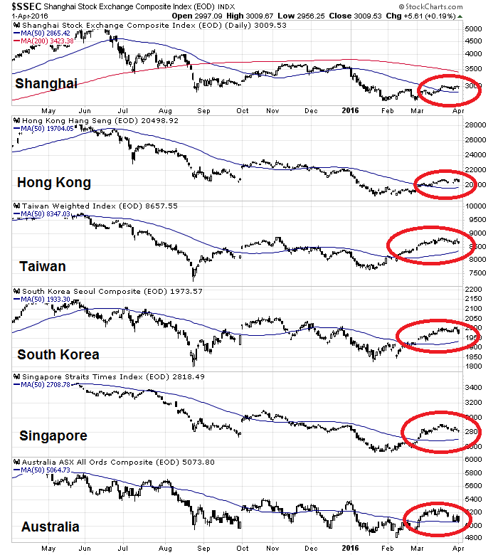 In Asia, we are seeing a similar pattern of market strength in China and the markets of her major Asian trading partners. All of those regional indices have rallied above their 50 dma lines.