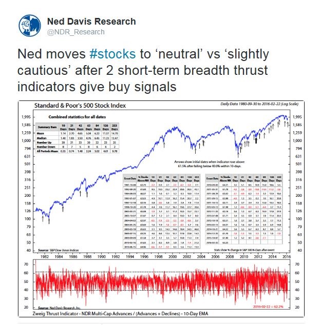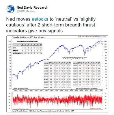 Breadth has also turned sufficiently positive that Ned Davis Research upgraded its tactical view from cautious to to neutral. Their analysis of stocks above the 50 dma shows a breadth thrust, which has historically shown bullish implications.