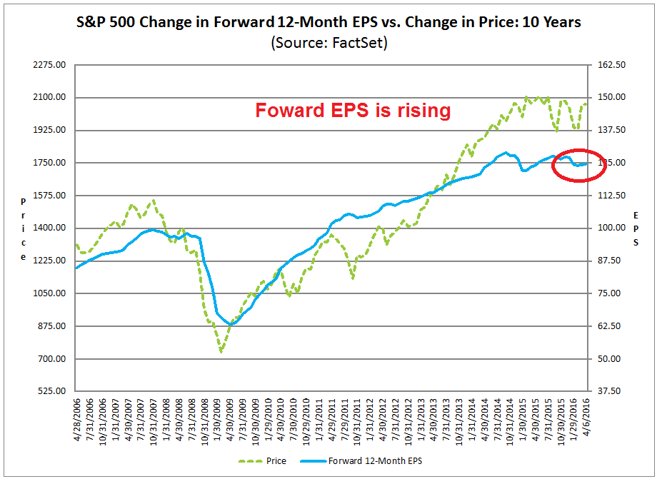 In addition, the same Factset report I cited above shows that optimism is returning to the Street. Forward 12-month EPS estimates are rising again, which is positive.