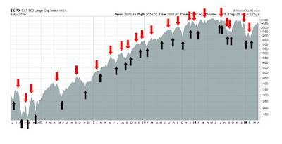 My inner trader uses the trading component of the Trend Model seeks to answer the question, “Is the trend getting better (bullish) or worse (bearish)?” The history of actual out-of-sample (not backtested) signals of the trading model are shown by the arrows in the chart below. Past trading of this model has shown turnover rates of about 200% per month.