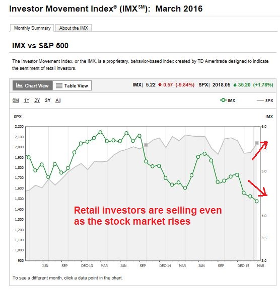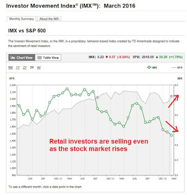 The latest March 2016 report from TDAmeritrade Investor Movement Index (IMX) confirms the level of public skepticism. IMX (green line), which tracks the degree of retail investor market participation, has been falling even as the market rallied off its February lows (annotations in red are mine).