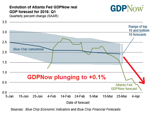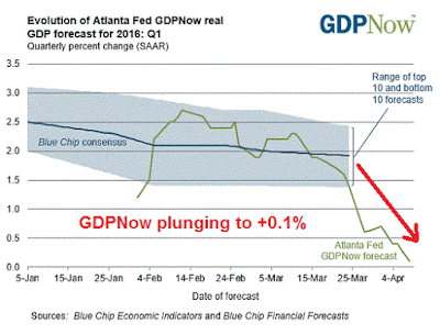 The backwards looking data is indeed bleak. The Atlanta Fed GDPNow nowcast of Q1 GDP growth is plunging and now stands at a barely positive 0.1%, which is an enormous drop from the 2%+ readings back in February. At this point, a negative Q1 GDP print would not be a big surprise.