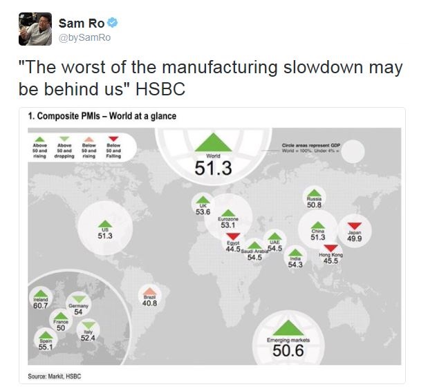 What’s more, the industrial recovery is not just localized to the US, but appears to be global. PMI readings are picking up all around the world (via Sam Ro).