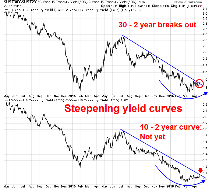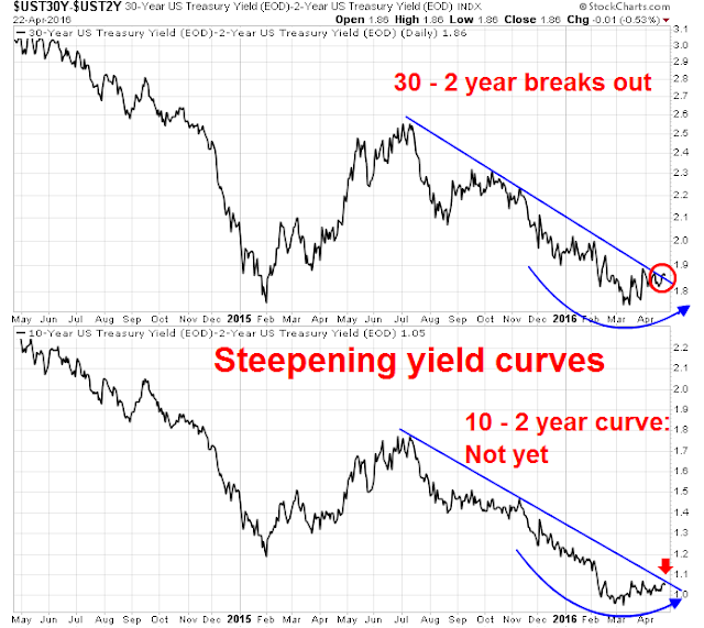 I interpret the surge in commodity prices as a sign of rising growth – and these signs are reflected in the fixed income markets as well. The crowded long position in bonds that I identified is resolving itself with a steepening yield curve (see What does the crowded long position in bonds mean for stocks?). The chart below shows that the 30 – 2 year yield curve has staged an upside breakout, though the 10 – 2 year curve has yet to break out yet.