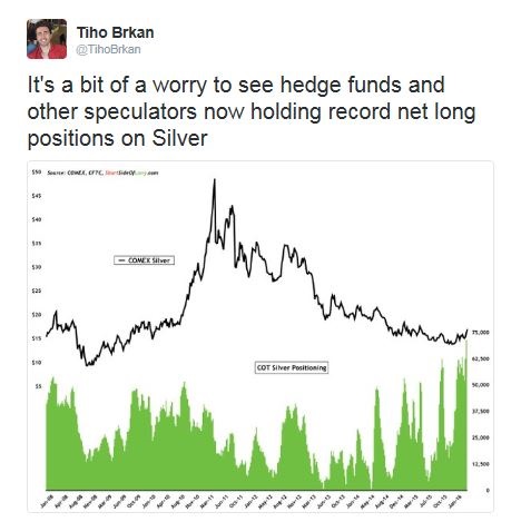The flip side of the USD weakness coin is commodity strength. The post child of commodity strength are the precious metals and Tiho Brkan pointed out that gold miners are now highly overbought: