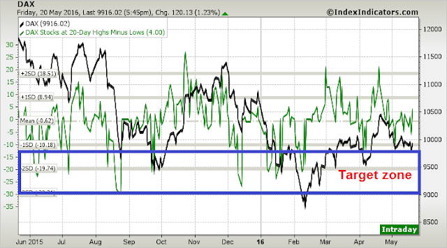 More conventional measures of breadth from IndexIndicators show that the net 20-day highs-lows, which is an intermediate term (2-3 week) trading indicator, is not oversold.