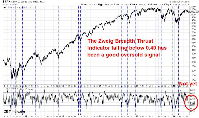 While it was not meant to be primarily used in this fashion, but the Zweig Breadth Thrust Indicator falling below 0.40 has also shown itself to be a pretty good oversold signal in the past. Note that the oversold condition is only the setup for the ZBT signal and the market has to stage an upward momentum thrust for the ZBT signal to be triggered (see A possible, but rare bull market signal). As the chart below shows, the ZBT Indicator is getting close, but it is not oversold yet.