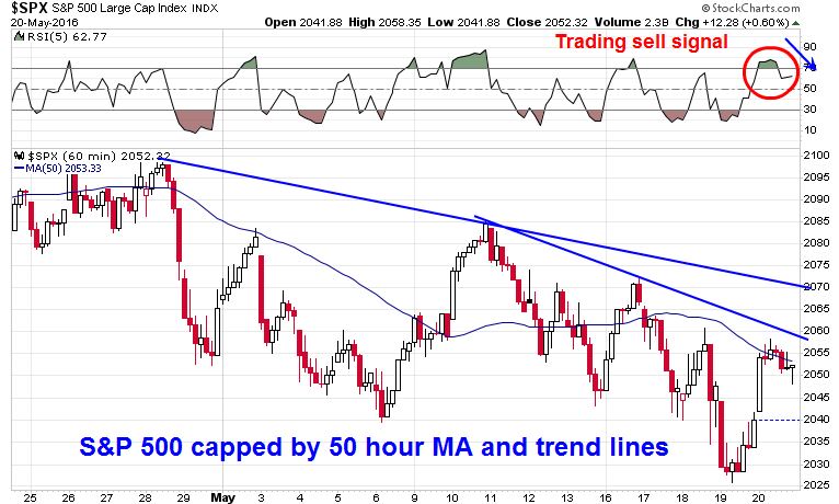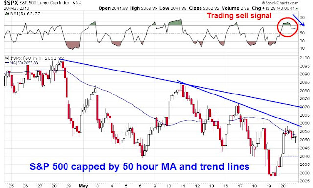 From a trader’s perspective, the bears still have control of the tape as momentum is still pointed downwards. The hourly SPX chart below shows that the market remains below key resistance levels, such as the 50 hour moving average and a couple of downtrend lines. The inability of the market to convincingly rise above its 50 hour MA and its weakness on Friday generated a very short-term sell signal on RSI-5.