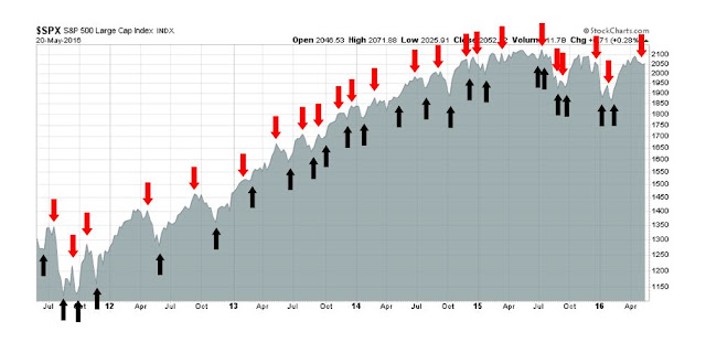 My inner trader uses the trading component of the Trend Model to look for changes in direction of the main Trend Model signal. A bullish Trend Model signal that gets less bullish is a trading “sell” signal. Conversely, a bearish Trend Model signal that gets less bullish is a trading “buy” signal. The history of actual out-of-sample (not backtested) signals of the trading model are shown by the arrows in the chart below. Past trading of the trading model has shown turnover rates of about 200% per month.