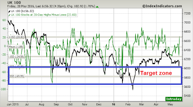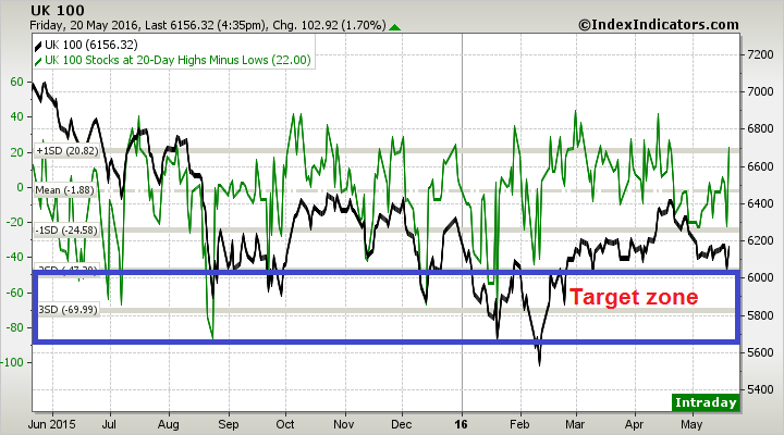 More conventional measures of breadth from IndexIndicators show that the net 20-day highs-lows, which is an intermediate term (2-3 week) trading indicator, is not oversold.