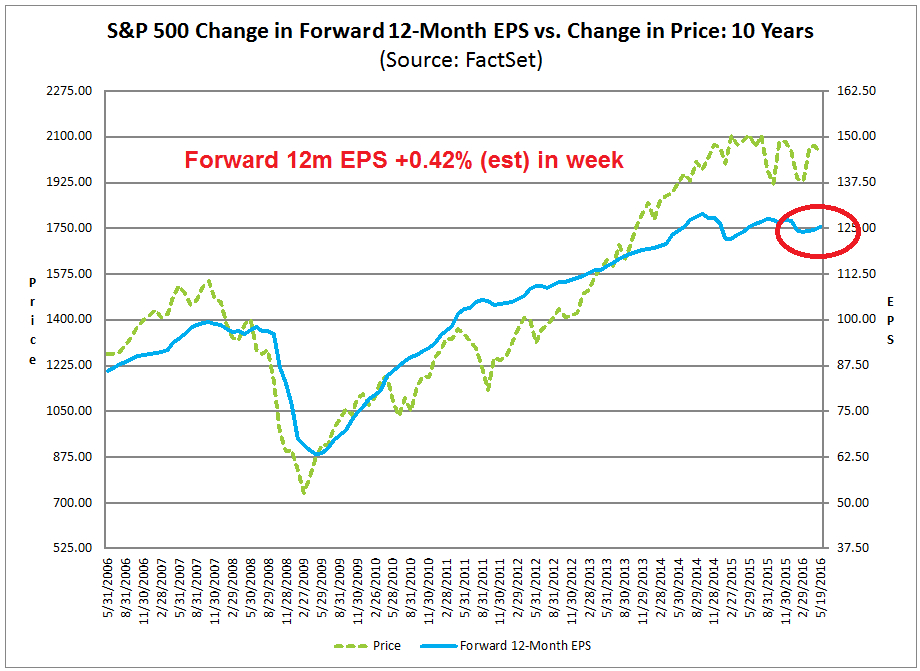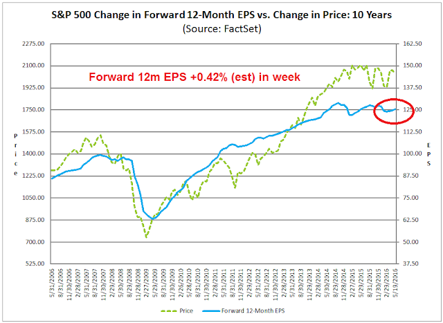 Earnings are backward looking. I have found that a blended 12-month forward looking EPS estimate is a much better way of measuring Street sentiment: