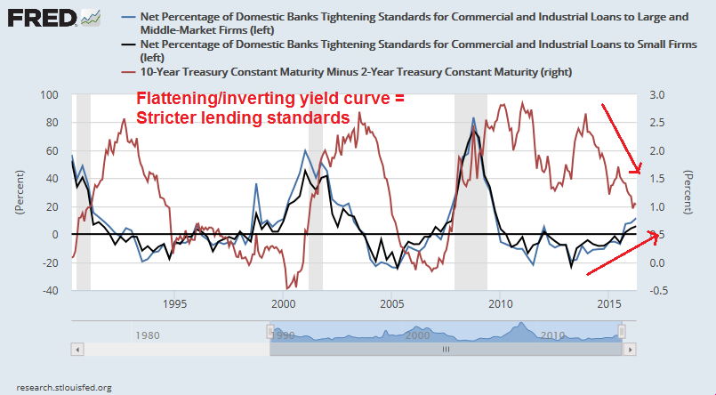You can’t get an inverted yield curve under ZIRP. That’s why significant flattening in Japan has led to recession after its ZIRP was implemented over a decade ago – while prior to that it had been inversion that signaled enough credit tightening to lead to recession. It is therefore possible that we’ll experience similar behavior going forward – and we’ve had enough flattening to be concerned at this point.