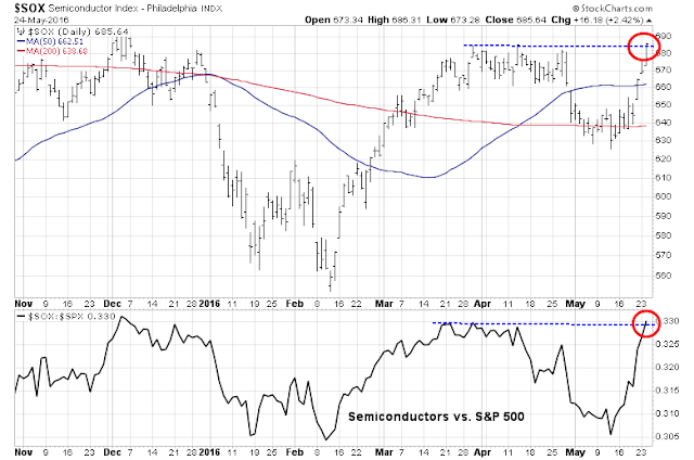 Another positive cyclical development has been the dramatic rally in the semiconductor stocks, which staged a marginal upside breakout from resistance on an absolute (top panel) and relative (bottom panel) basis. While these stocks appear to be extended in the short term, their turnaround is a positive signal for the global growth outlook.