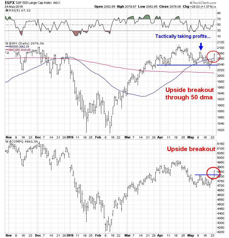 Since then, the SPX weakened to test an important technical support at 2040, which represents the neckline of a potential head and shoulders formation. (As all good technicians know, a head and shoulders formation isn’t complete until the neckline is broken.) While the market did break 2040 last week on an intra-day basis, neckline support held. In addition, the NASDAQ Composite confirmed the strength today by staging an upside breakout through resistance.
