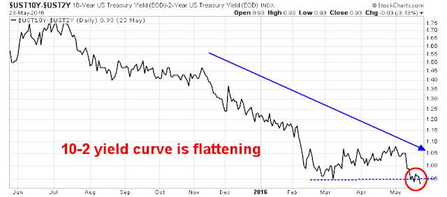 The bear case getting less bad. This is mostly all about the Fed. The price action of the USD and the flattening yield curve can be explained by the sudden hawkish Fedspeak in the last couple of weeks after the dovish tone from the last FOMC statement. Tim Duy summarized the disagreement within the FOMC as a debate over whether the economy faces inflationary pressures from the employment picture, as the decline in the unemployment rate has stalled because the participation rate is rising again: