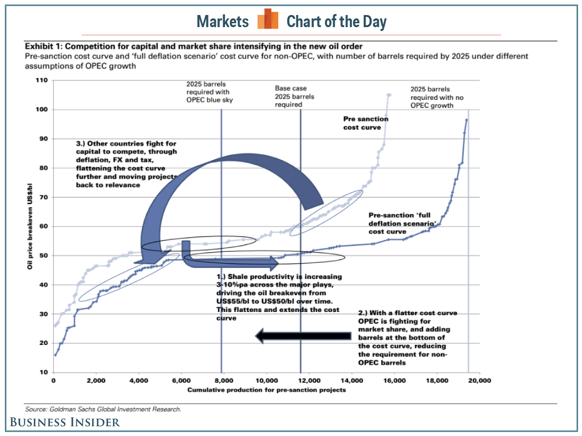 A recent Goldman Sachs research report (via Business Insider) postulates a much flatter cost curve for oil production because of ever improving tight oil technology, whose production can be shut-in and restarted quickly, and the desire of OPEC countries to maintain market share.