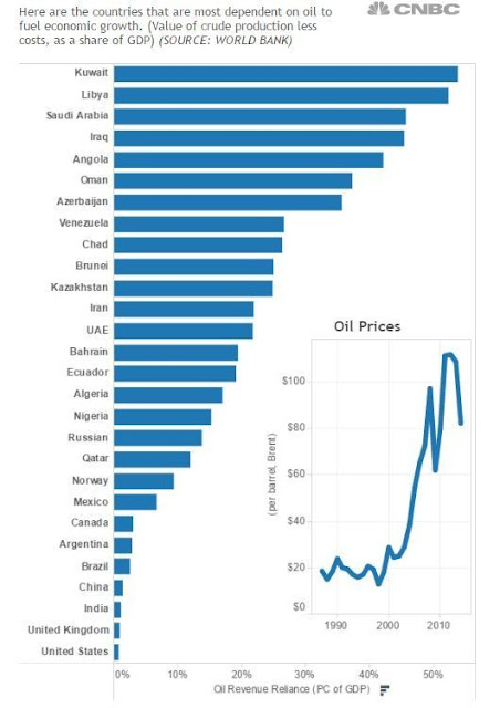The problem isn`t just limited to Saudi Arabia. This chart shows oil exports as a percentage of GDP (via WEF). The list is headed by Kuwait, followed by Libya. Saudi Arabia is third on the list.