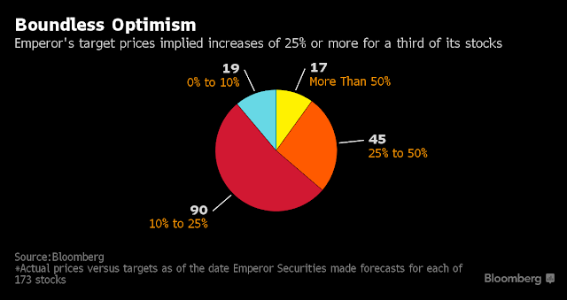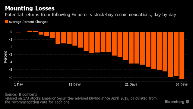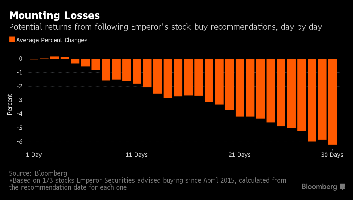 The unit of Emperor Capital Group Ltd. issued buy recommendations on every one of the 173 companies it reported covering from April 2015 through May 16. Its target prices, which the company says forecast trading levels within weeks, predicted gains of 25 percent on average. They are frequently the most bullish among analysts who cover the same stocks and list their calls with Bloomberg, including those based on the standard 12-month horizon.