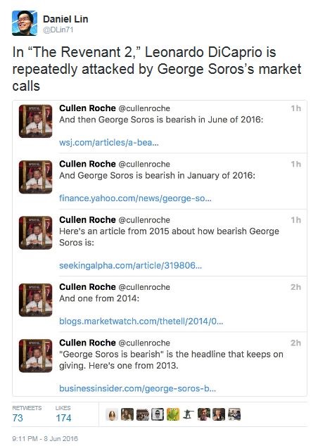 While Soros is unquestionably an investment legend, his calls have not always been infallible. This Bloomberg article details some of his most recent hits and misses over the last few years. The WSJ article also prompted reminders of how many times journalists have published “Soros is bearish” stories in the past.