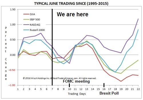 Looking to the week ahead, most of the downside damage may have already been done if the historical June trading pattern depicted by Jeff Hirsch repeats itself. There will be two key events in June with unpredictable binary outcomes, namely the FOMC meeting next week and the Brexit referendum on June 23. If I were to take a wild-eyed guess (and remember it’s only a guess), the trading pattern identified by Hirsch is consistent with a scenario of a positive surprise at the FOMC meeting, followed by a declined caused market anxiety over the Brexit referendum and a relief rally based on a Remain outcome. Barring any big surprises from the FOMC meeting, the most likely scenario is a sloppy range-bound market until the Brexit question gets resolved.