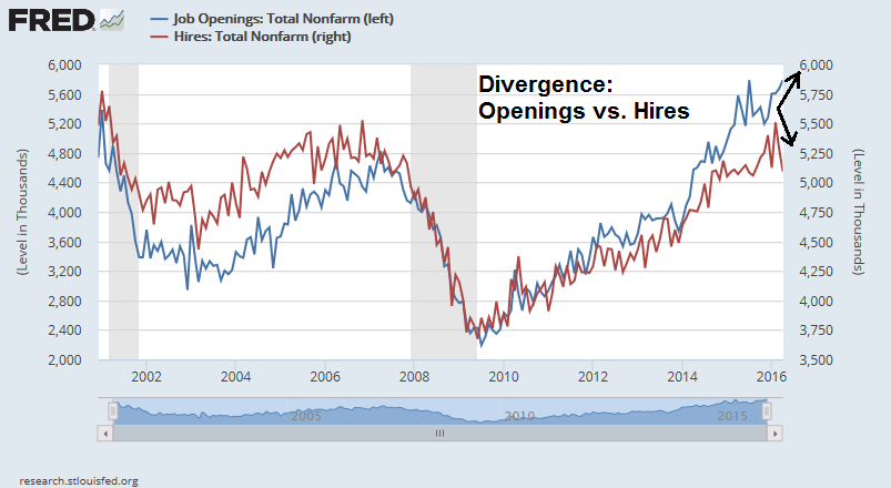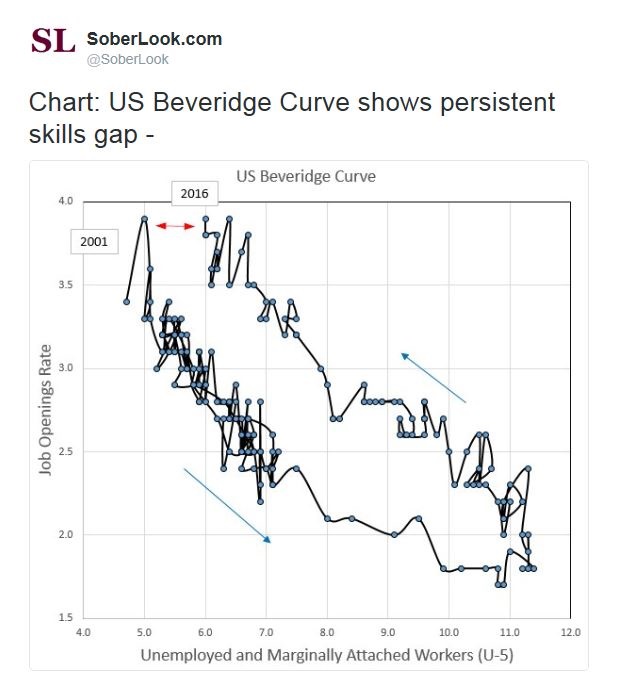 The more likely explanation is a skills gap, as explained by the Beveridge curve (via Sober Look).