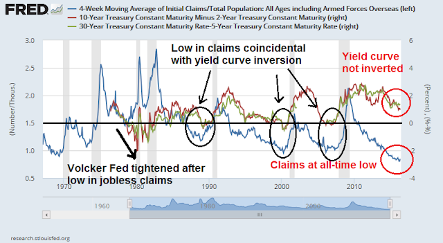Consider, for example, initial claims as a proxy for the employment picture and how it has behaved along with the yield curve, which has been a sure-fire recession indicator in the past. As the chart below shows, recessions have followed occasions when initial claims (blue line) has bottomed out and started to rise. Initial claims are now at an all-time low. If the labor market is indeed deteriorating, then initial claims should start to rise soon. Further analysis showed that lows in claims have coincided with periods of yield curve inversion (circled). Only once in the days of the tight monetary policy era of the Volcker Fed in late 1970s, has the yield curve continued to invert after the bottom in initial claims. Currently, the yield curve, regardless of how it’s measured (2/10 or 5/25), is not inverted. This divergence casts doubt about whether a recession is imminent.