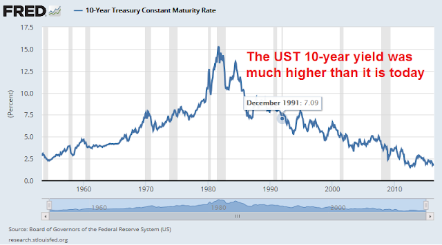 As the table below shows, the current market forward P/E multiple of 16.4 is modestly above the 1992 multiple of 14.3. An examination of the biggest differences in P/E multiples reveals that they are Energy, which is understandable because its earnings have been devastated by the oil crash, Consumer Staples and Utilities (annotations are mine).