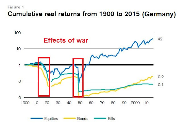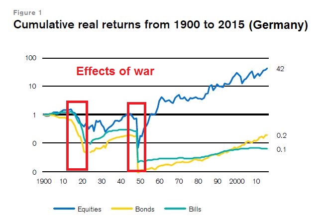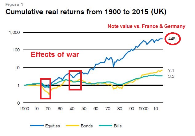 The UK fared a lot better as unfriendly foreign troops never set foot on its soil. On an inflation adjusted basis, its equity returns was an order of magnitude better than France or Germany.