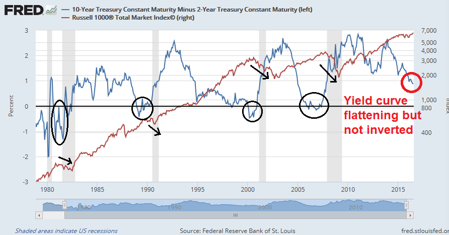 As the chart below shows, the circled yield curve inversions, where the 10-year rate is below the 2-year rate, have tended to lead equity bear markets. While the yield curve has been flattening, it is a long way from an inverted state.